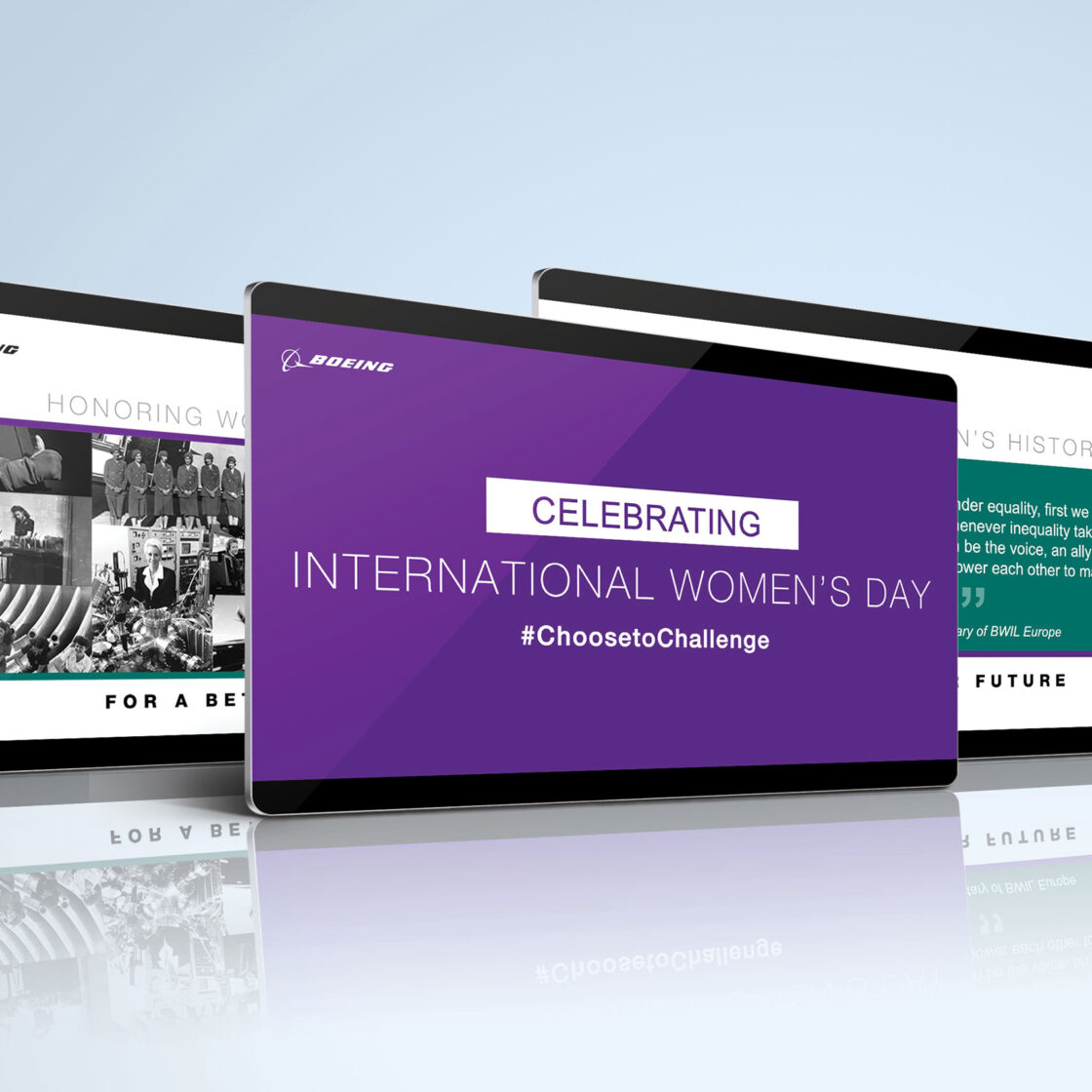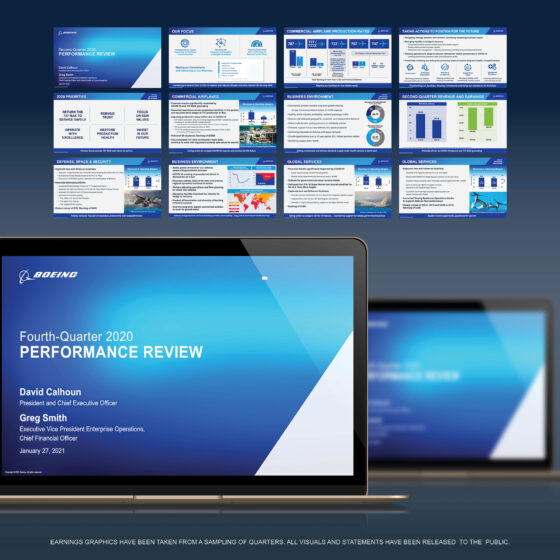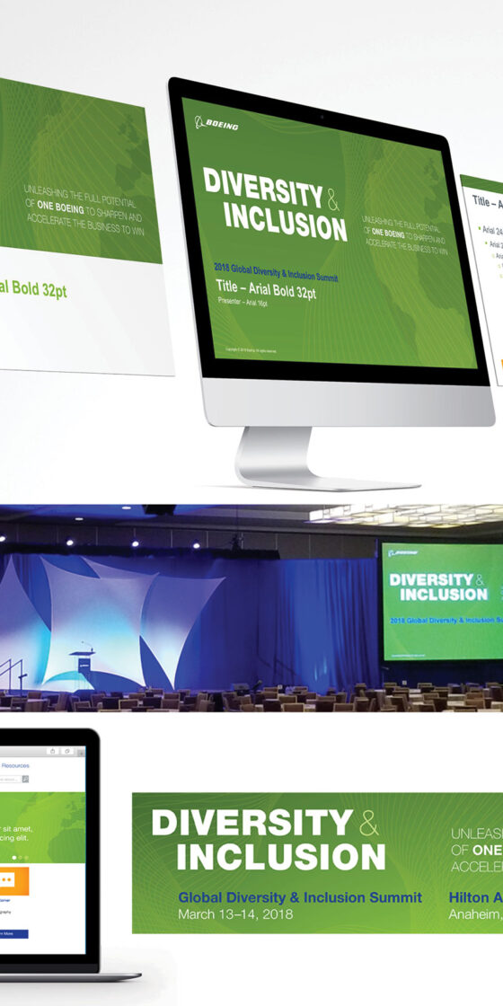 Developed designs for corporate earnings, shareholder meetings, air shows, DAVOS, sponsorships, internal/external events and additional creative for: Global Equity, Diversity & Inclusion, Sustainability, Engineering, COVID Response, Crisis Comms, Space & Defense, Commercial Airplanes, Future Mobility, Factory/MFG., Supply Chain, Acquisitions, Legal, Gov Ops, HR, IT/Tech and Community Engagement